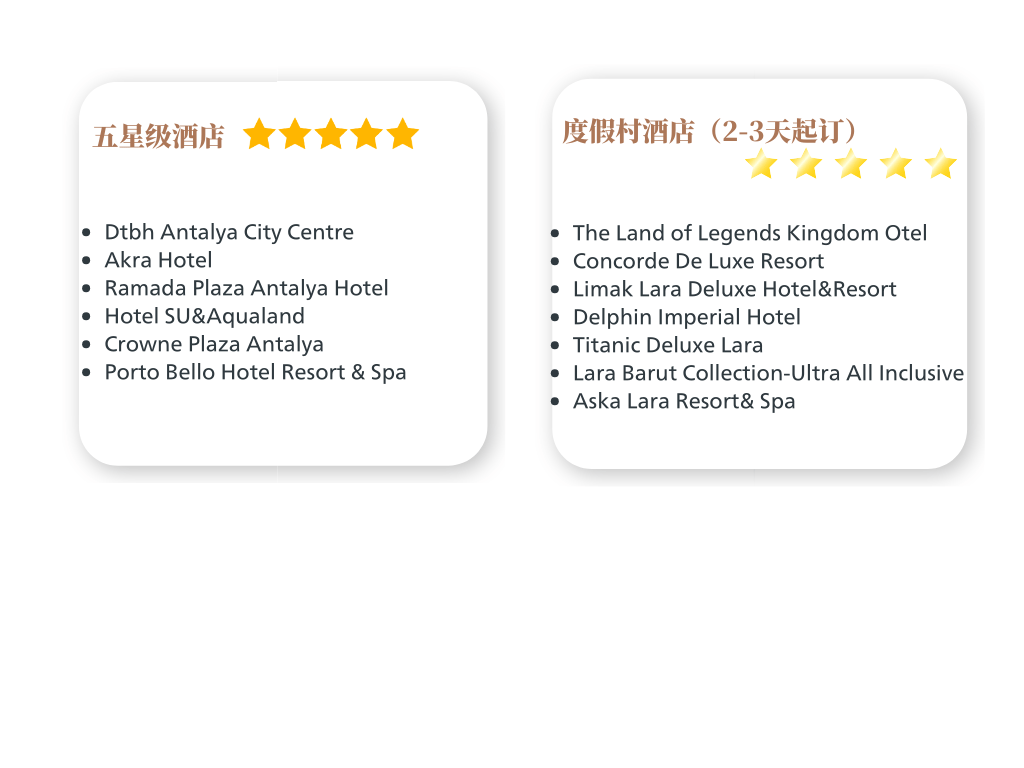 我们根据多次实地体验与客户反馈,精选安塔利亚最具代表性的酒店类型,帮助你找到真正适合自己的住宿选择。